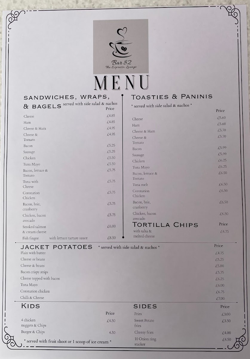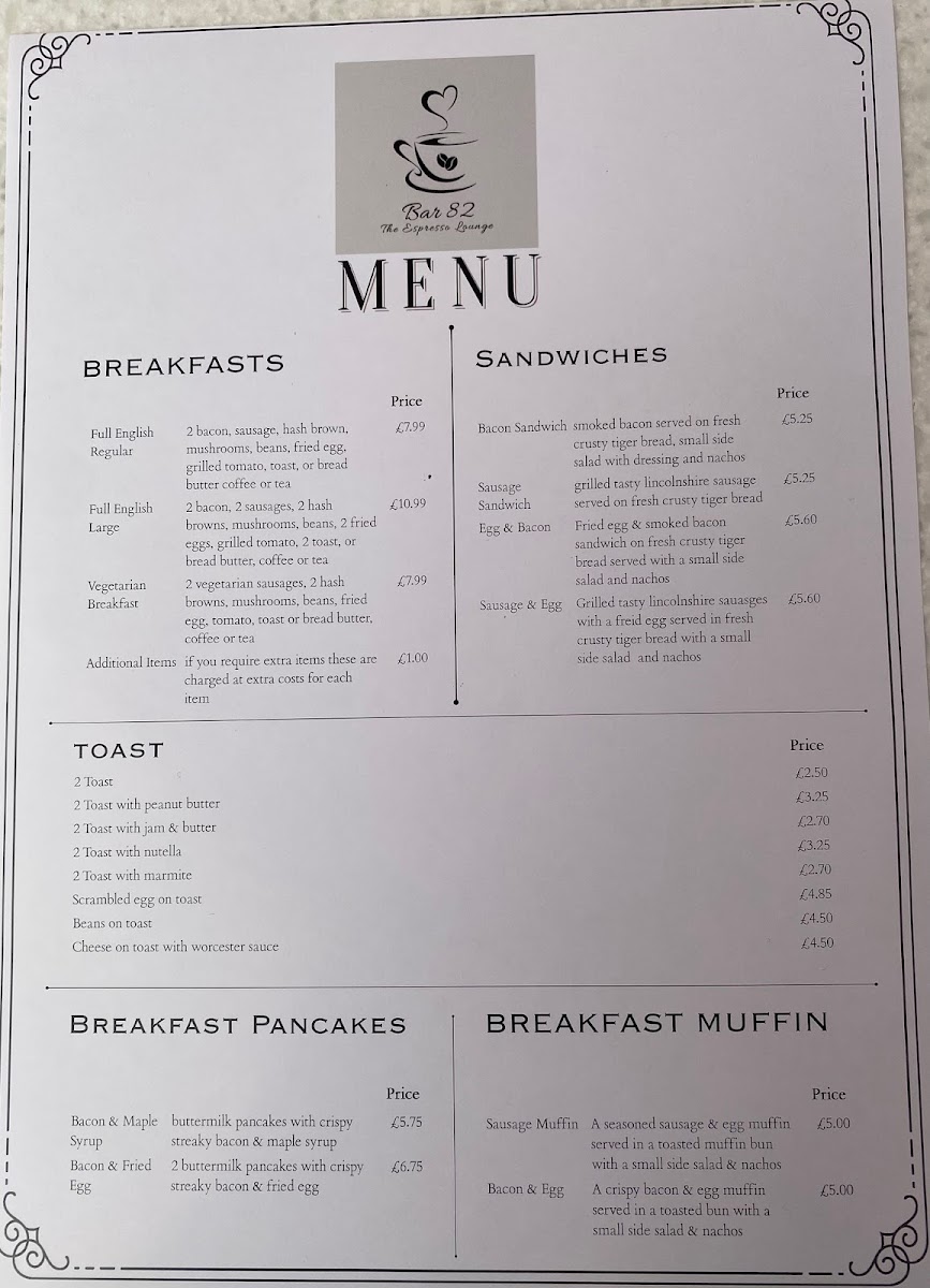 Welcome to Bar 82 The Espresso Lounge, a delightful café located at 82 Culver St E, Colchester. The menu here is a delightful journey for the palate, offering a wide array of delicious options. From expertly crafted Cappuccinos (£2.90) to the robust Americano, every sip is a step into coffee perfection.